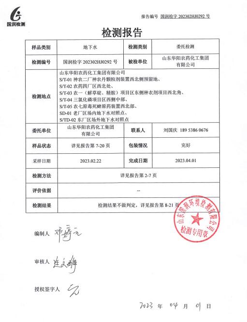 山東華陽(yáng)農(nóng)藥化工集團(tuán)有限公司地下水檢測(cè)報(bào)告